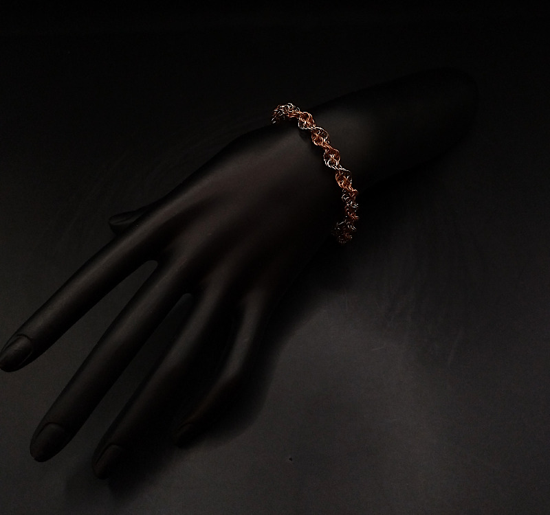 Die doppelt spiralförmig verflochtenen Ringe bilden eine flexible, geschmeidige Kettenstruktur, die sich angenehm an das Handgelenk anschmiegt. Durch den Wechsel zwischen glänzendem Edelstahl und warmer Bronze entsteht ein lebendiges Farbspiel, das Licht besonders eindrucksvoll reflektiert. Diese dynamische Optik verleiht dem Armband sowohl Eleganz als auch eine moderne, künstlerische Wirkung.
